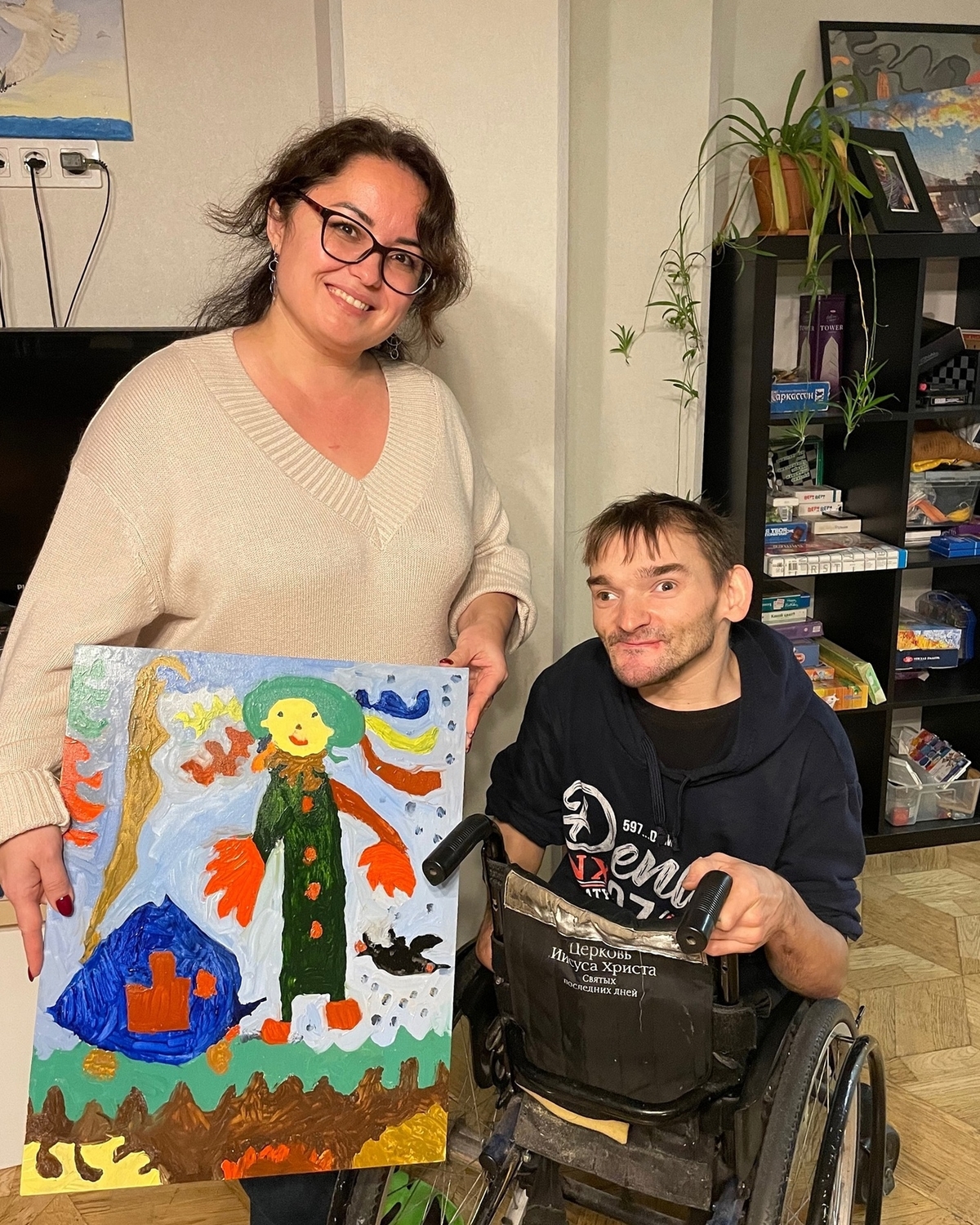 На фото — житель квартиры на Морской, художник Кирилл Шмырков и Лейсан с картиной Кирилла, которую он подарил фонду «БлагоДарение» на долгую память.